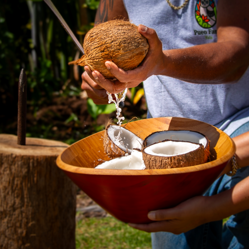Located in Upcountry Maui Kula farmlands, Kula Pueo Farm uses organic and regenerative practices growing flowers, vegetables, tomatoes, citrus and many other fruit. Kula Pueo Farm invites guests to tour their 2-acre farm with friendly and expert staff and sample produce, take photos, and enjoy the peace and beauty of Upcountry Maui. With short, easy, grassy walks, enjoy their huge variety of flowers and produce and 360 views of mountains, ocean, and islands. Or, take a comfortable seat under the sunbrella and enjoy a cup of coffee, some snacks, and the view. Guests will also enjoy watching Alohi husk coconuts and sampling the coconut water and meat. And, guests are invited to choose some freshly harvested vegetables, herbs and fruit to take with them, and to make a lei to wear!